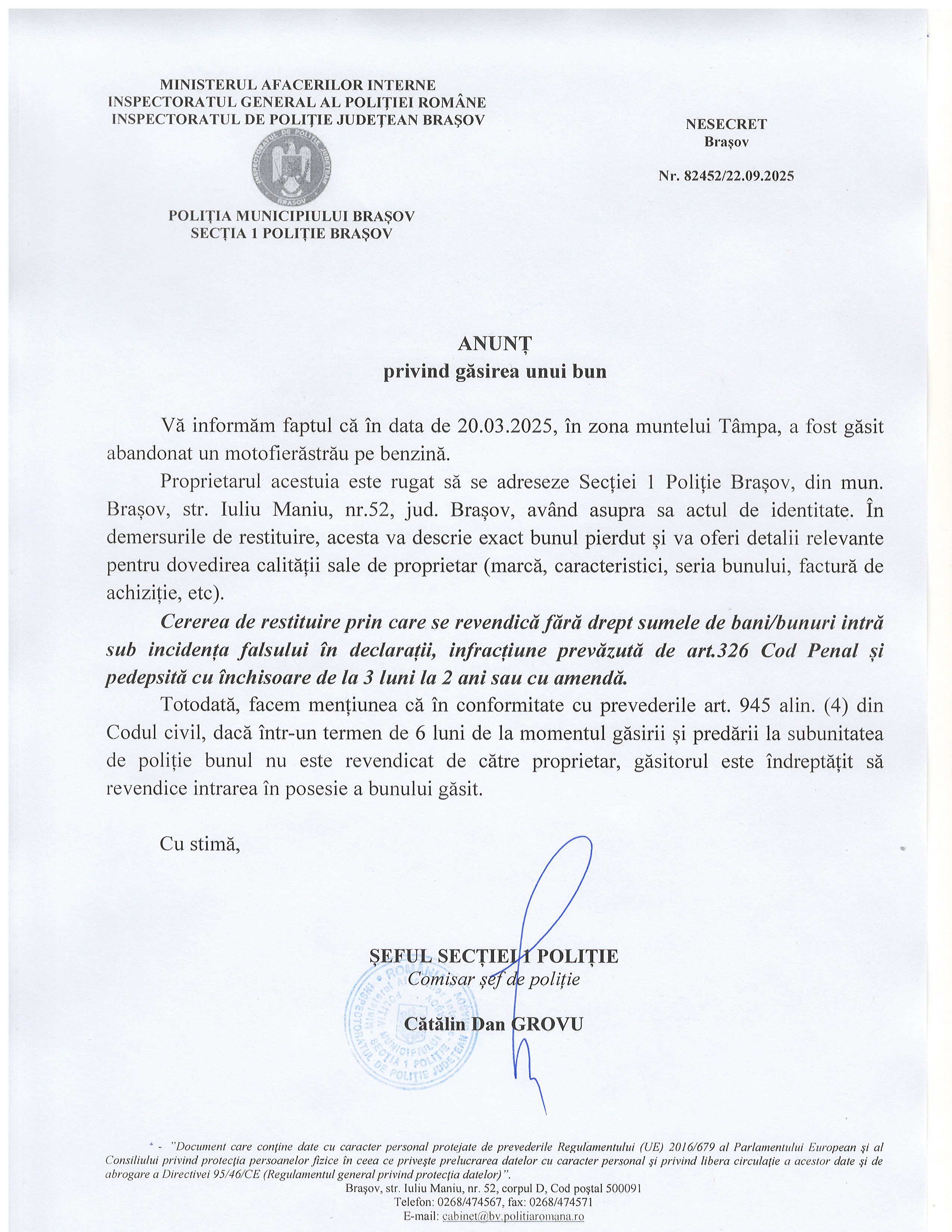 În această secțiune vor fi postate informații referitoare la bunurile găsite și predate poliției.